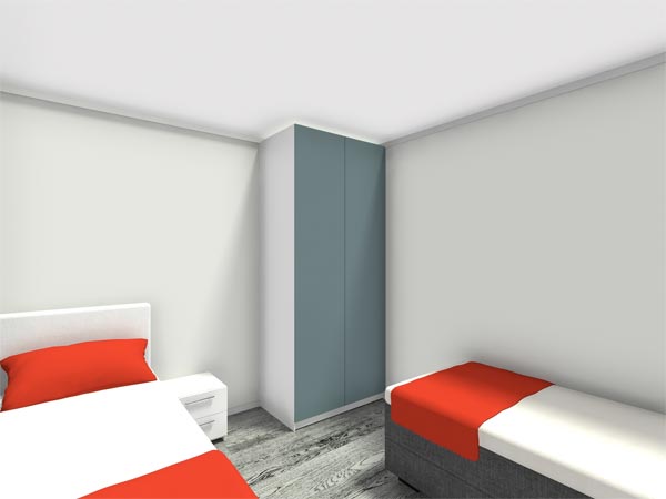18mm matt finish white melamine wardrobes carcasses draw set, shelves & doors, 2300mm high units, with 100mm long D handles. soft close hinges, 2 no. S/S hanging rails.